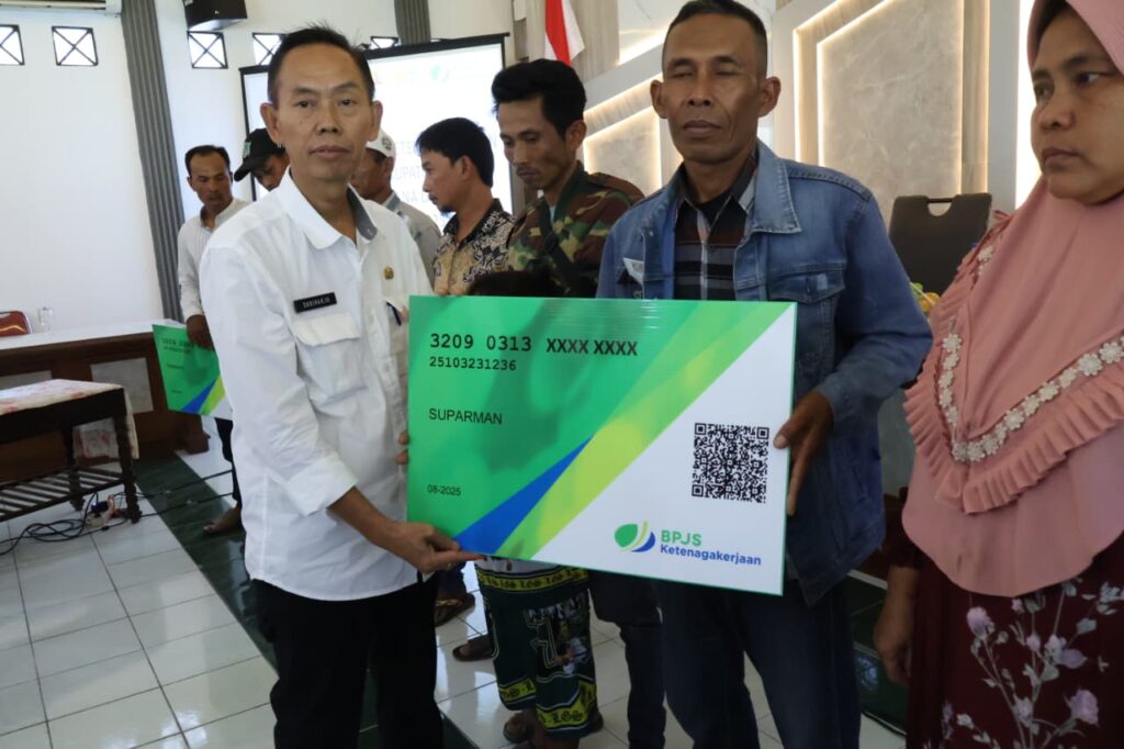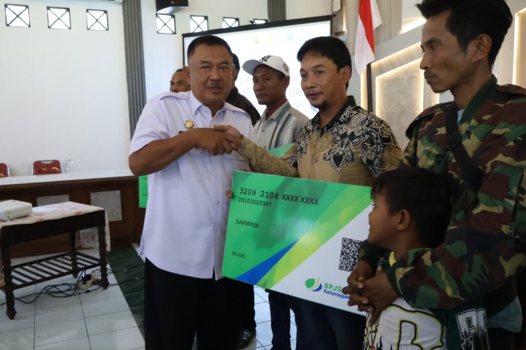 KABUPATEN CIREBON — Wakil Bupati Cirebon, Agus Kurniawan Budiman, secara simbolis menyerahkan kartu Badan Penyelenggara Jaminan Sosial (BPJS) Ketenagakerjaan kepada nelayan di Off-Room, Pendopo Bupati Cirebon, Rabu (10/9/2025).