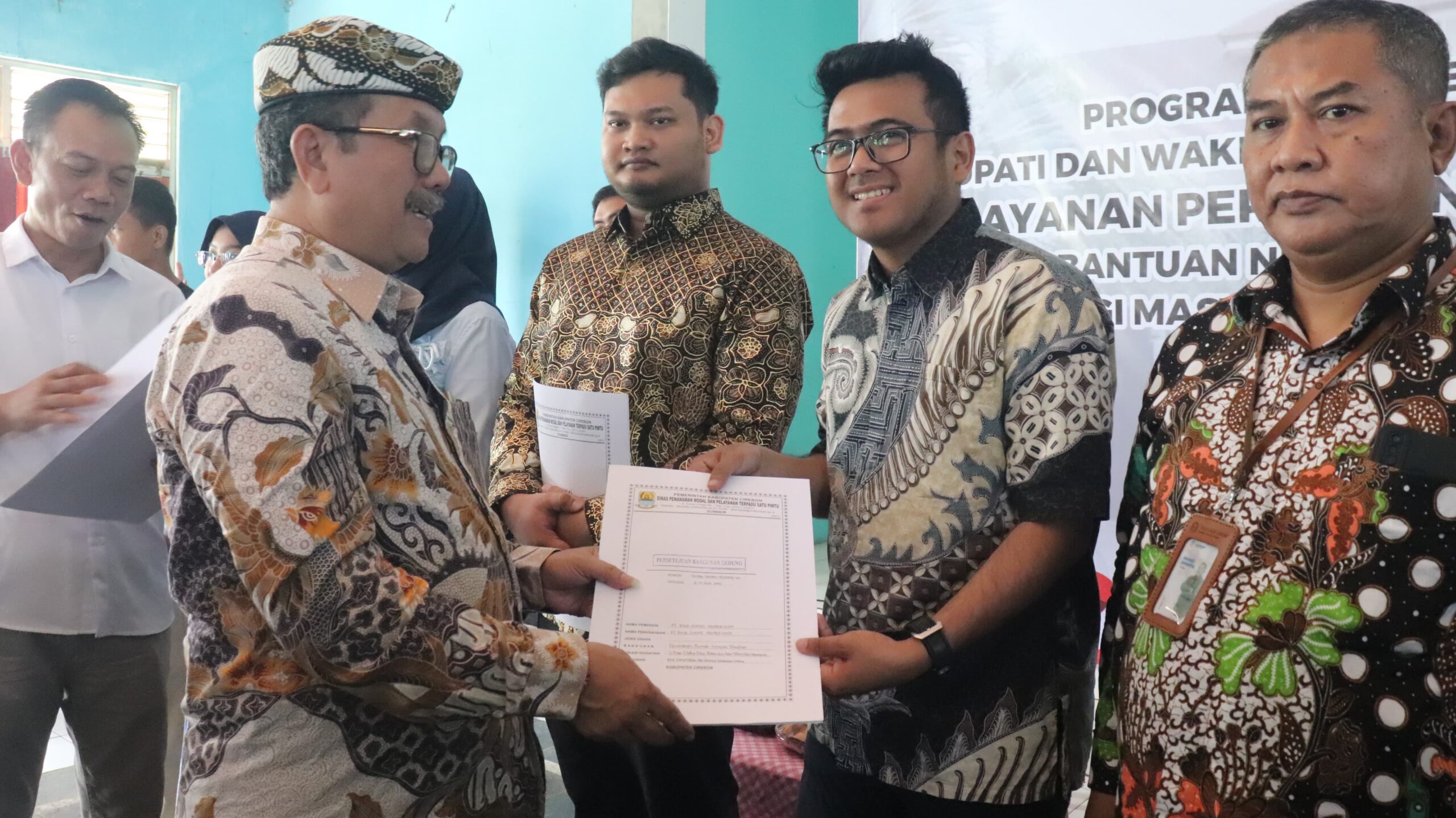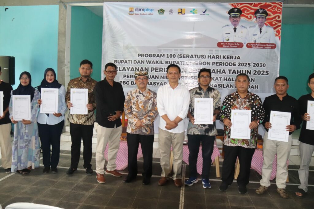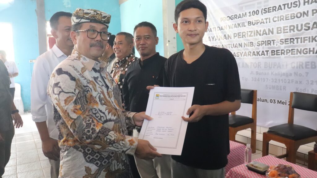 KABUPATEN CIREBON — Bupati Cirebon, Imron, menghadiri kegiatan Pelayanan Perizinan Berusaha Terpadu Tahun 2025 di Gor Desa Sampiran, Kecamatan Talun, Sabtu (3/5/2025).